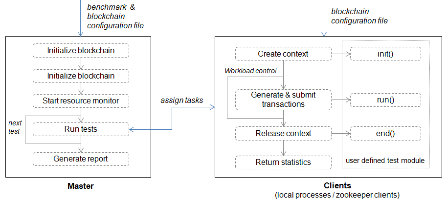 - 총 workload는 분할되어 하위 프로세스에 똑같이 할당됩니다. 하위 프로세스는 일시적으로 생성된 컨텍스트를 사용하여 블록체인 클라이언트 역할을 하여 백엔드 블록체인 시스템과 상호작용 합니다.