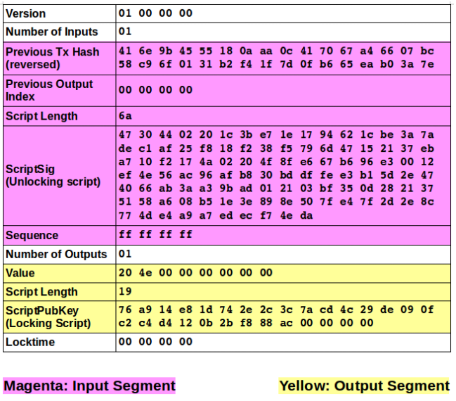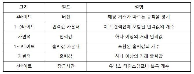 이러한 거래는 입력값과 출력값으로 구성되어 있으며 거래의 입력값과 출력값은 계좌 혹은 신분에 상관 없이 소유주나 비밀키를 알고 있는 사람만이 풀 수 있는 특수 비밀키로 잠겨 있고 수많은 필드를 포함하고 있습니다.