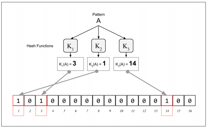 A 패턴을 3개의 해쉬함수를 통하게 할경우 K1 해쉬함수의 출력값은 인덱스 3이고, 해당 3번 인덱스에 해당하는 배열의 비트를 1로 설정합니다.